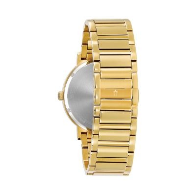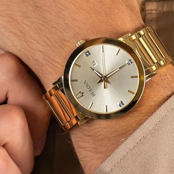 El Bulova 97D115 es un reloj masculino elegante de la colección Futuro, diseñado con una estética sofisticada y detalles de lujo. Presenta una caja redonda de acero inoxidable con acabado dorado y una esfera color champán adornada con tres acentos de diamante que aportan un toque distinguido. Su movimiento de cuarzo ofrece precisión fiable y bajo mantenimiento, y la ventana de fecha añade comodidad al uso diario. El cristal mineral curvado de borde a borde realza la esfera, brindando un estilo clásico y moderno al mismo tiempo. BulovaCaracterísticas