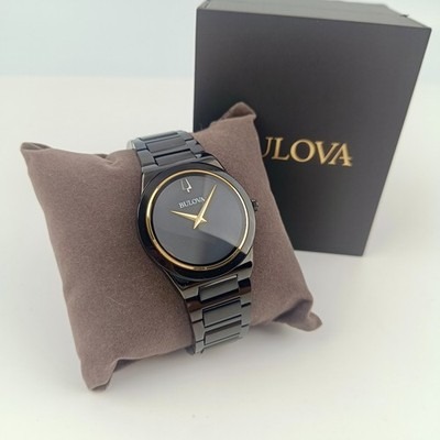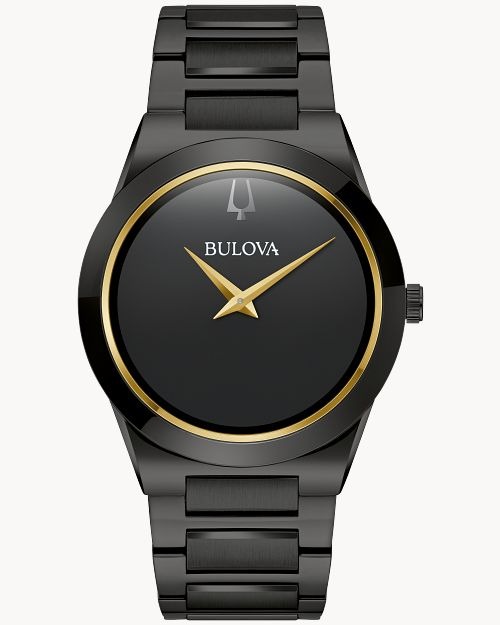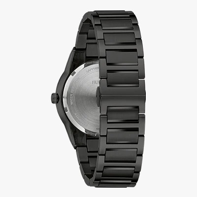 El Bulova 98A313 es un reloj masculino de diseño moderno y minimalista, perteneciente a la colección Modern. Presenta una caja y brazalete de acero inoxidable con acabado negro, combinados con una esfera negra de estilo limpio y detalles en tono dorado. Su estética elegante lo hace ideal para uso urbano o de vestir. Incorpora un movimiento de cuarzo de alta precisión y un cristal de zafiro abovedado que realza su apariencia sofisticada.