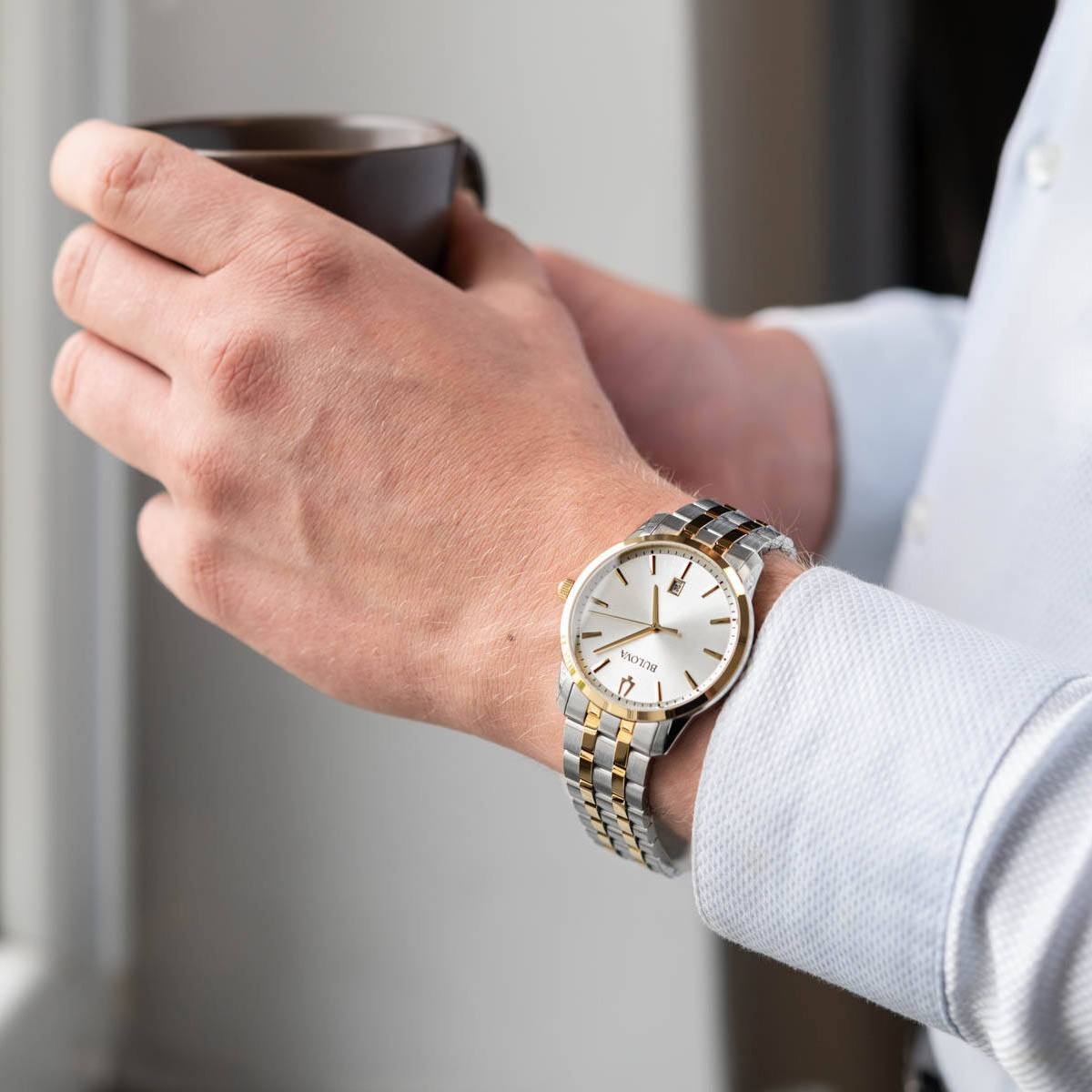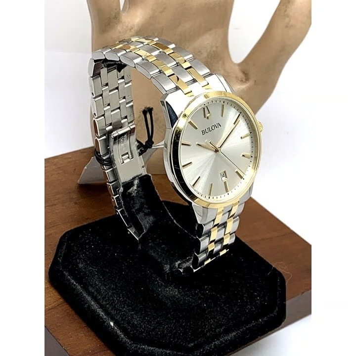 El Bulova 98B385 es un reloj masculino clásico de la colección Sutton, diseñado para quienes buscan un estilo elegante y versátil. Presenta una caja y brazalete de acero inoxidable bicolor (plateado y dorado), combinados con una esfera plateada que realza sus detalles dorados en marcadores y manecillas. Su estética combina lo formal con lo cotidiano, adecuado para uso diario, oficina o eventos especiales. Funciona con un movimiento de cuarzo preciso y ofrece una lectura de tiempo clara con fecha.