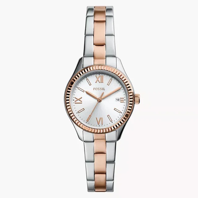 El Fossil BQW3928 pertenece a la colección Rye y destaca por su elegante diseño bicolor en tonos plateado y oro rosa, ideal para un estilo sofisticado y moderno. Su esfera plateada con acabado tipo rayos de sol (sunray) resalta con detalles en oro rosa y una ventana de fecha, creando un equilibrio perfecto entre lo clásico y lo contemporáneo. Con una caja de 30 mm, es un reloj cómodo, delicado y versátil, perfecto para uso diario o para ocasiones especiales.