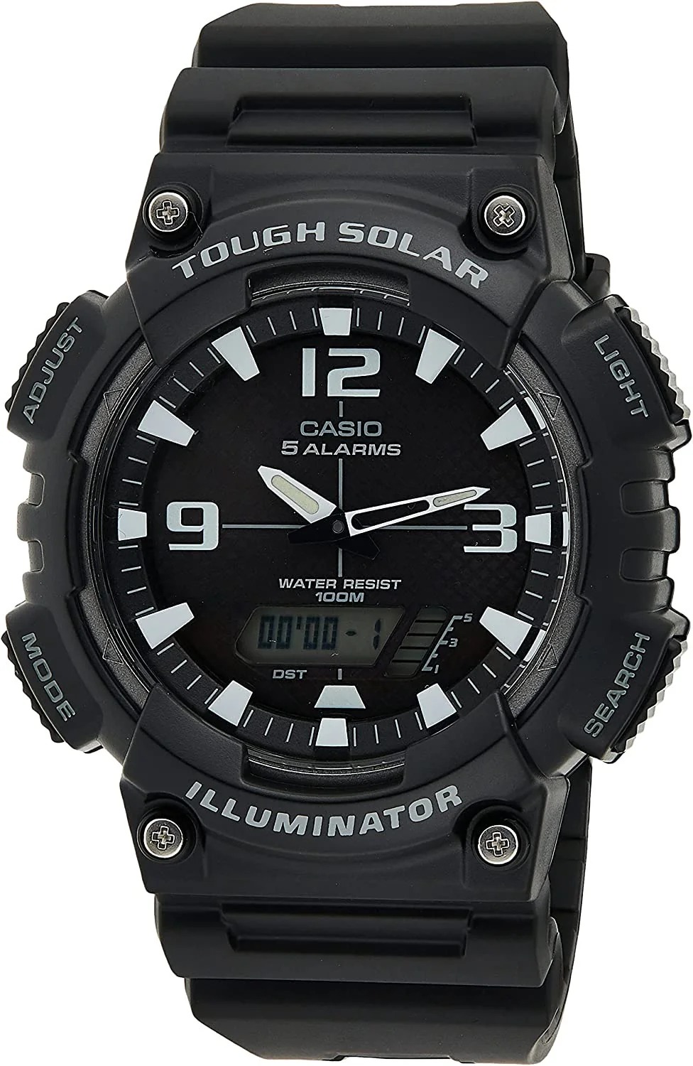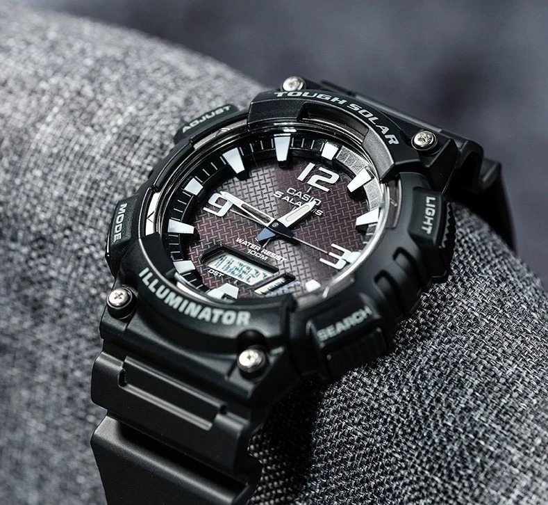 CASIO DE ENERGÍA SOLAR • Tough solar • Hora mundial • Cronómetro de 1/100 segundos • 5 alarmas • Luz LED (solo la parte LCD) • Resistente al agua hasta 100 metros • Diseño deportivo • Indicador del día de la semana en 6 idiomas (inglés, portugués, español, francés, alemán, italiano)