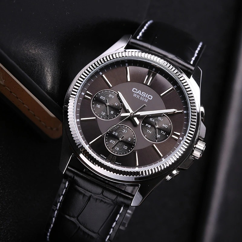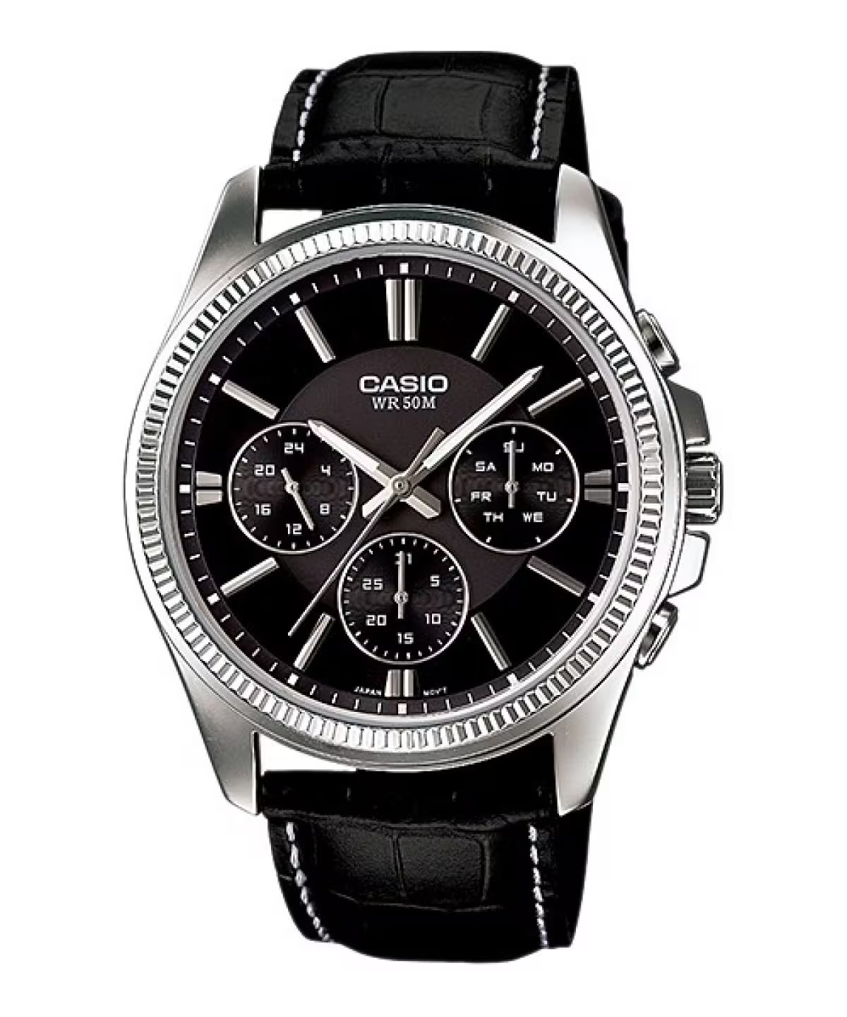 El Casio MTP-1375L-1A es un reloj masculino de estilo clásico con diseño funcional y elegante. Combina una caja de acero inoxidable plateado con una esfera negra profunda y marcadores contrastantes, lo que facilita la lectura del tiempo y aporta un look elegante para uso diario o formal. Este modelo incorpora tres subesferas para mostrar día de la semana, fecha y hora de 24 h, ofreciendo más información de un vistazo sin complicar la estética. La correa de cuero genuino negro brinda comodidad y un estilo tradicional, mientras que el movimiento de cuarzo analógico de alta precisión asegura un desempeño confiable con bajo mantenimiento.