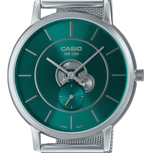 El Casio MTP-B130M-3A es un reloj masculino elegante con un diseño minimalista moderno que destaca por su esfera verde y su pulsera tipo malla en acero inoxidable. Es una pieza limpia, sofisticada y muy en tendencia, perfecta para quienes buscan un reloj sencillo pero con estilo distintivo. Ideal para uso diario, oficina o looks casuales elegantes.