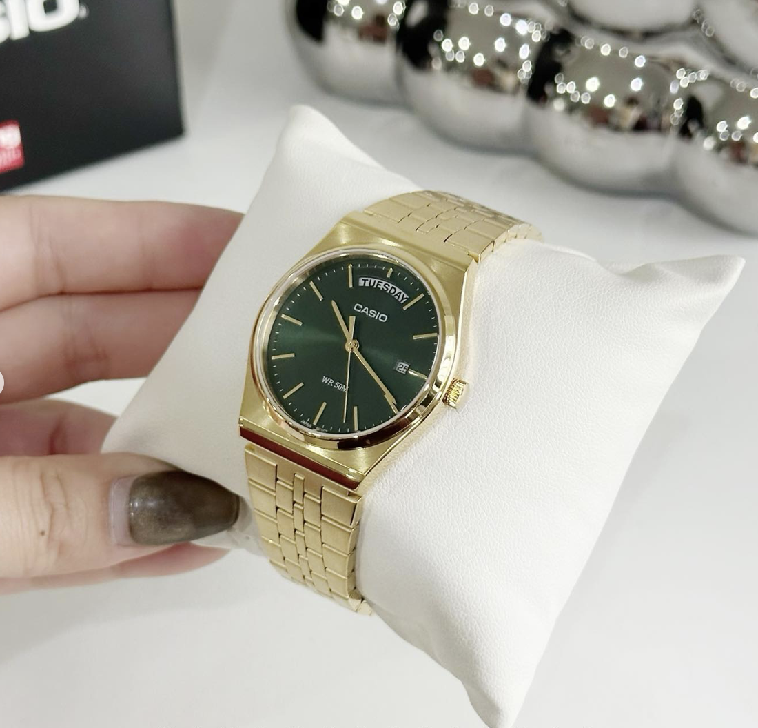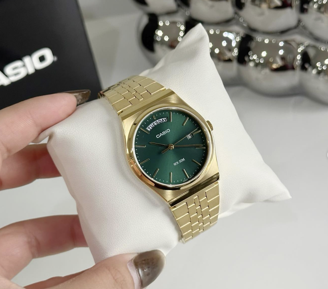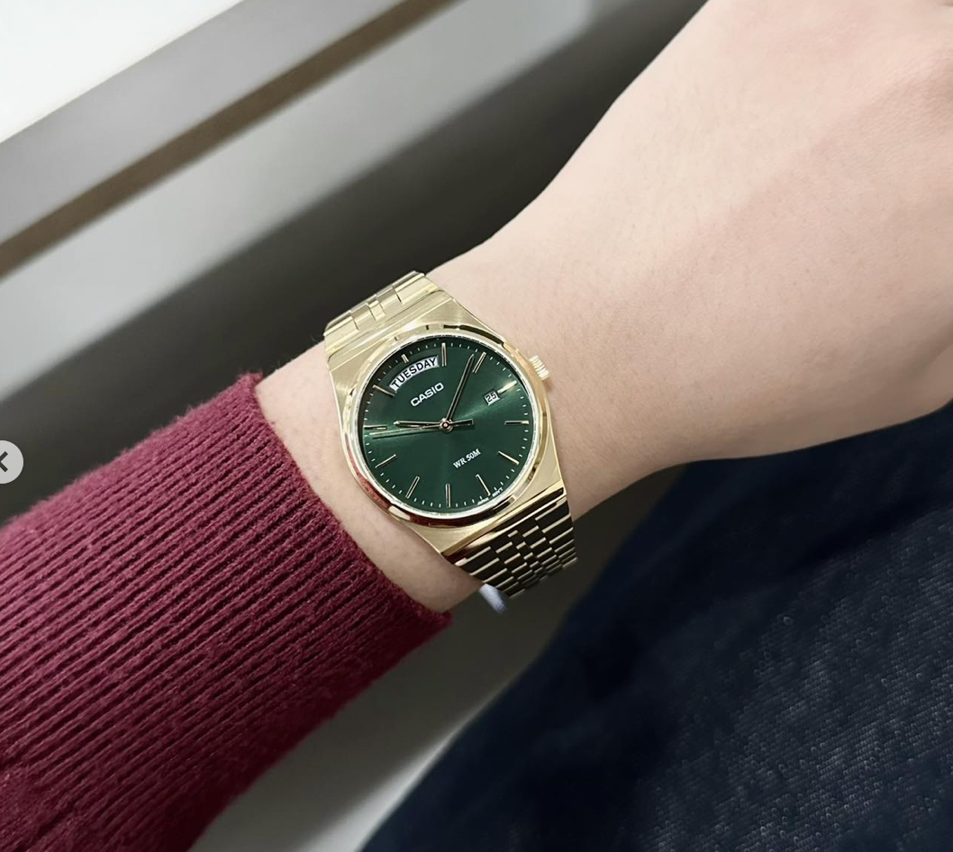 • Diseño retro: Este modelo presenta una estética inspirada en los años 80, con una esfera verde y una correa de acero inoxidable con acabado en ion dorado, ofreciendo un aspecto elegante y atemporal.