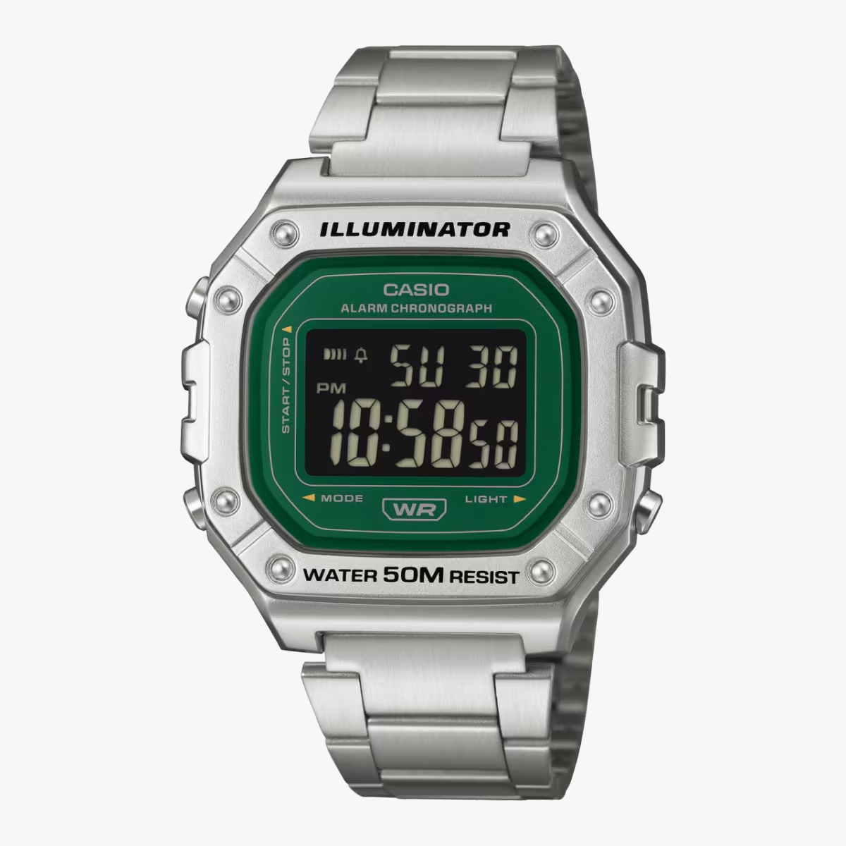 El Casio W-218HD-3A es un reloj digital de estilo deportivo con un diseño robusto y moderno, destacado por su pantalla con fondo verde que le da un aspecto distintivo y actual. Combina la estética clásica de los relojes digitales de Casio con un brazalete de acero inoxidable que eleva su apariencia hacia un look más urbano y versátil.