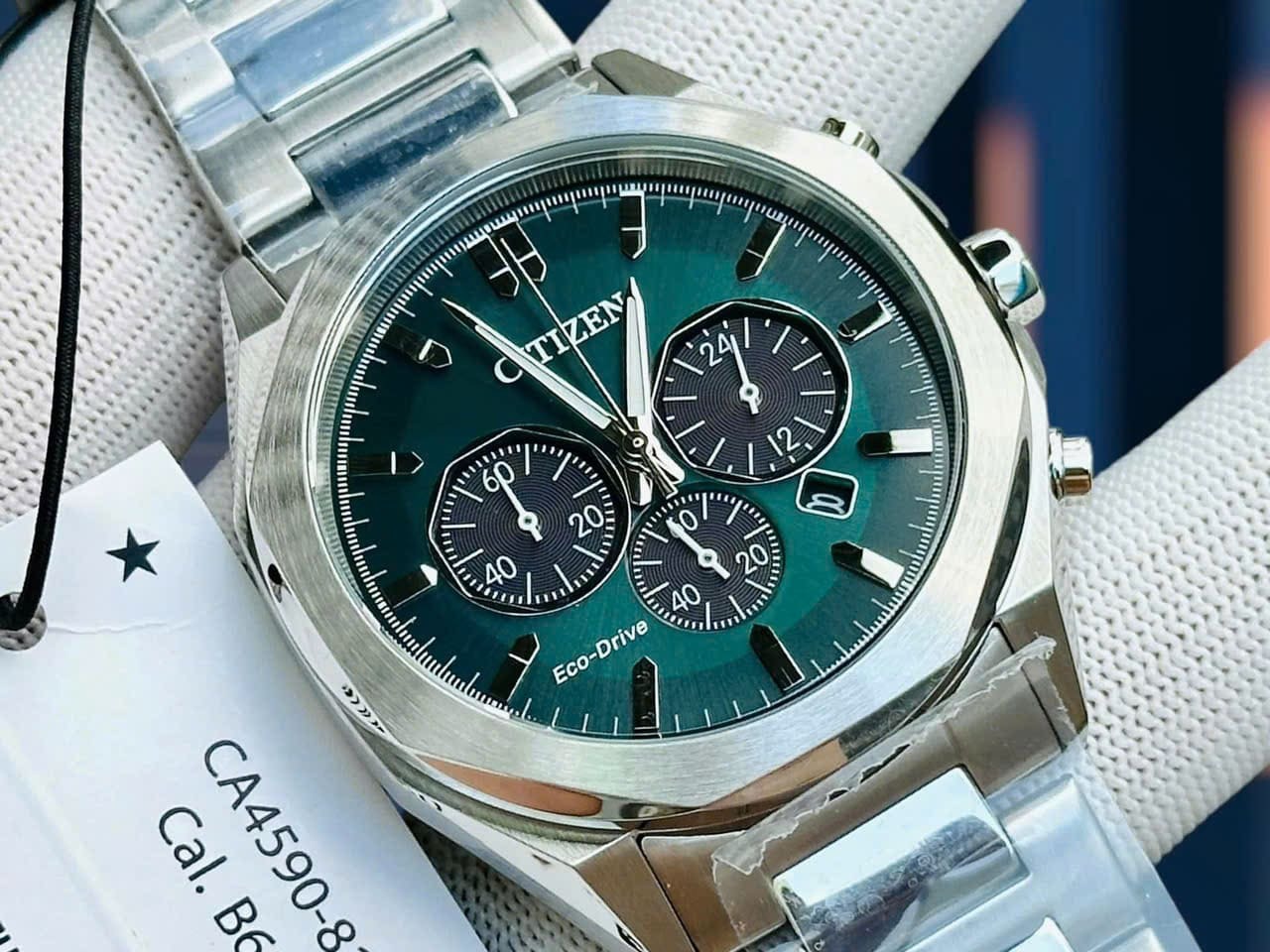 El CA4590-81X es un cronógrafo moderno de estilo deportivo-elegante de la línea Eco-Drive. Está diseñado con una caja de acero inoxidable de 41 mm, bisel octogonal distintivo, esfera verde intensa y brazalete a juego. Funciona con el movimiento Eco-Drive calibre B620, que se recarga con luz y elimina la necesidad de cambiar pilas. Integra funciones útiles como cronómetro, visualización de 24 horas, fecha y una resistencia al agua apta para la vida diaria y la actividad ligera.