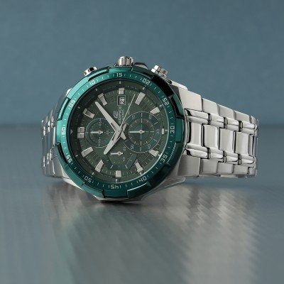 El Casio Edifice EFR-539DE-3A es un cronógrafo de gran tamaño con una estética fuerte y deportiva, pensado para quienes buscan presencia en la muñeca. Destaca por su bisel tridimensional con acabado ionizado en color verde, que le da un look moderno y diferente dentro de la línea Edifice.