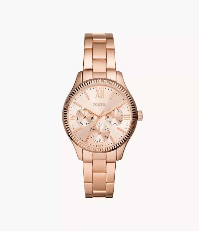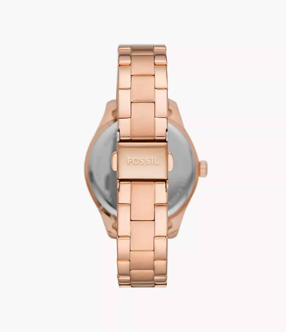 El reloj Fossil BQW3691 es una pieza elegante de la colección “Rye” para mujer, diseñada con acabado en tono oro rosa (rose gold-tone) que le otorga un aire contemporáneo y sofisticado. Con caja de 36 mm de diámetro según listado oficial, combina una esfera “sunray” de tono rosado que capta la luz de forma sutil, con pulsera de acero inoxidable en el mismo tono, lo que le confiere presencia sin resultar recargado. Su movimiento multifunción (indicando horas, minutos, segundos y subesferas adicionales) lo hace versátil para uso diario o para ocasiones más formales. La resistencia al agua de aproximadamente 5 ATM lo hace apto para salpicaduras y uso cotidiano, aunque no está pensado para inmersión intensa. Una excelente opción para quien busca un reloj femenino que sea a la vez accesorio de moda y pieza funcional.