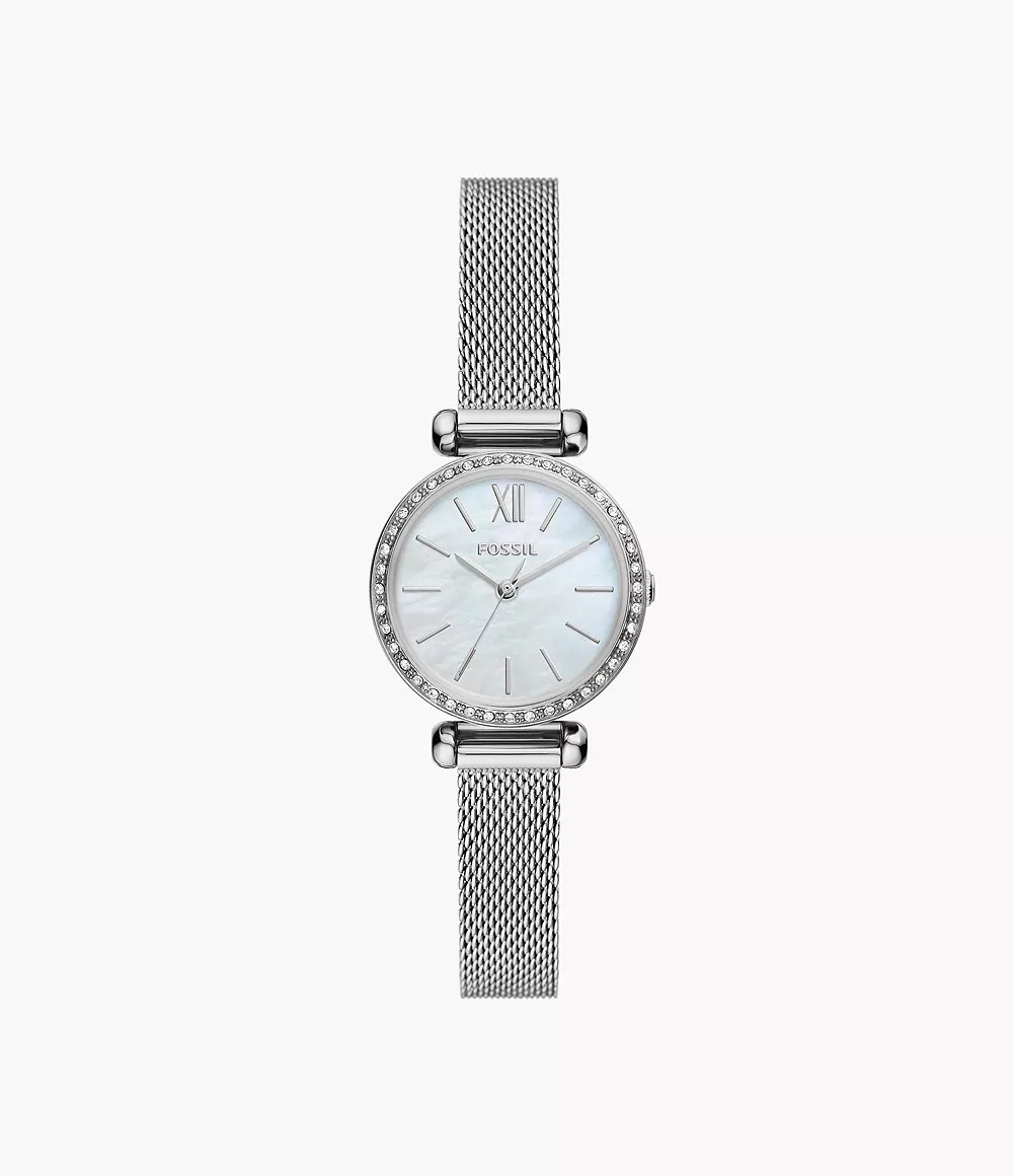 El Fossil BQW3896 de la línea Tillie Mini es un reloj femenino delicado y sofisticado, ideal para quienes buscan un accesorio pequeño, elegante y moderno. Su diseño con pulsera tipo malla (mesh) y esfera de nácar le da un acabado refinado y luminoso, perfecto para complementar looks minimalistas tanto casuales como formales. Es una pieza ligera, cómoda y muy femenina.
