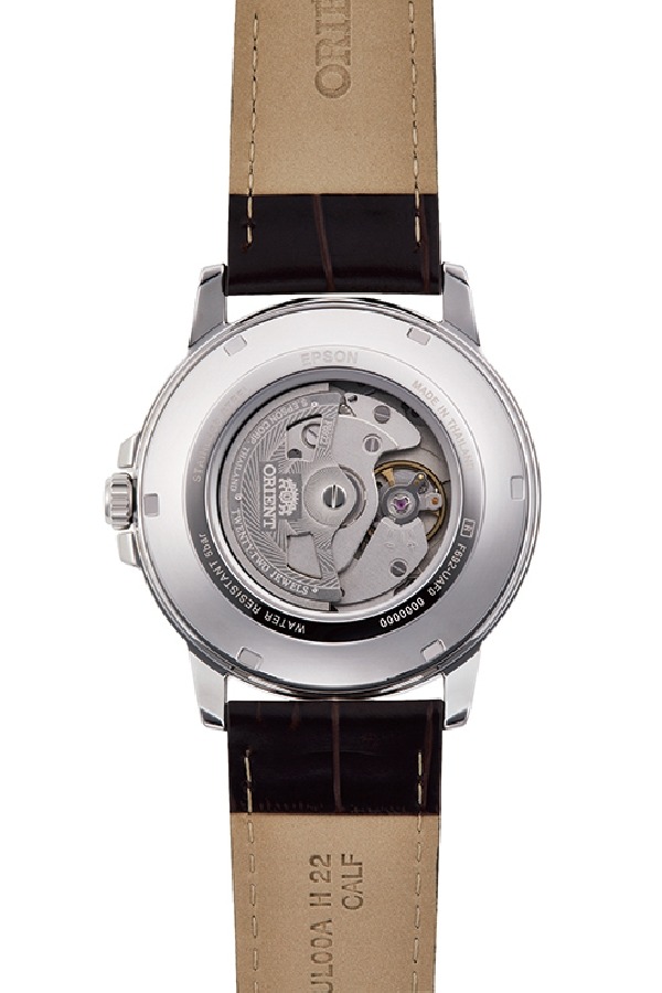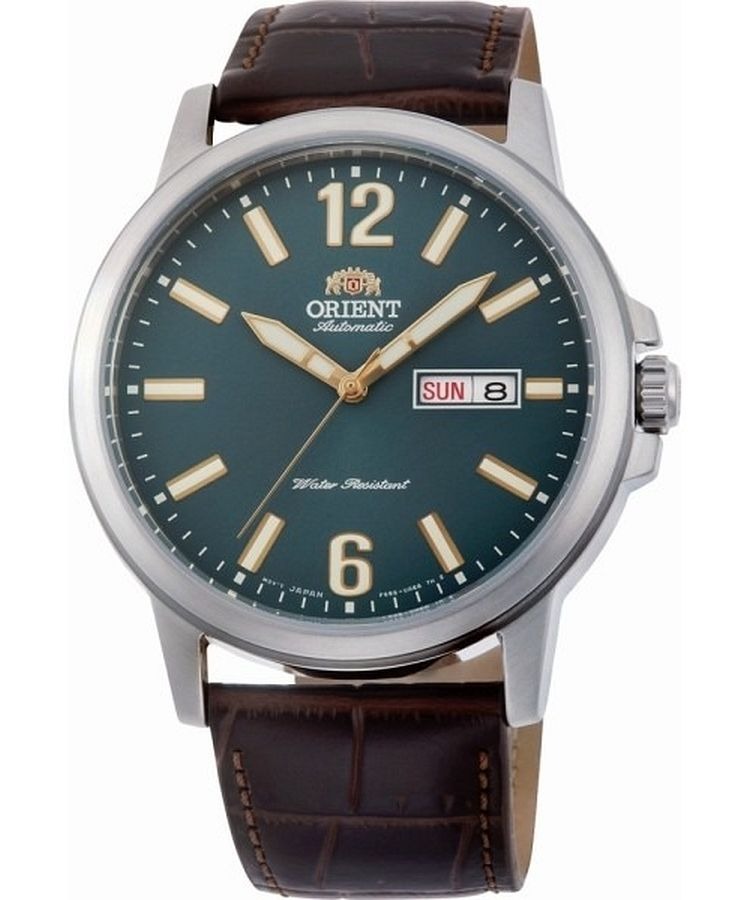 Reloj automático para hombre Orient RA-AA0C06E39B con diseño clásico deportivo y elegante, caja redonda de acero inoxidable plateado de 41.9 mm con esfera verde sunburst con índices y manecillas dorados luminosos, movimiento automatico japonés Orient calibre F6922 con función de cuerda manual y parada de segundero, reserva de marcha de aprox. 40 horas, cristal mineral resistente a rayaduras, ventana de día y fecha a las 3 h para mayor funcionalidad, correa de cuero marrón genuino con cierre de hebilla ajustable, fondo de caja transparente atornillado que permite ver el mecanismo interno, resistencia al agua hasta 50 m / 5 ATM ideal para salpicaduras y uso diario, mezcla de estilo clásico y fiabilidad mecánica con tradición relojera japonesa.