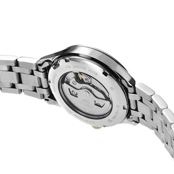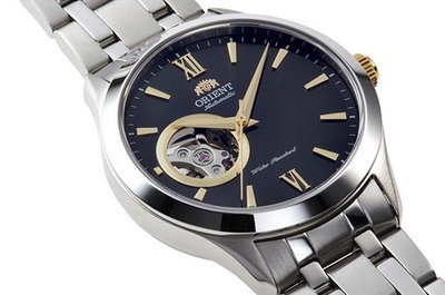 Reloj automático para hombre Orient TAG03002B0 con diseño Open Heart elegante y contemporáneo, caja de acero inoxidable plateado de 38.5 mm con bisel fijo y esfera negra con abertura que muestra parte del mecanismo interno, movimiento Orient calibre F6T22 con función de cuerda manual y parada de segundero (hacking) y reserva de marcha aproximada de 40 h, cristal de zafiro resistente a rayaduras, brazalete de acero inoxidable con cierre desplegable de seguridad, fondo de caja transparente (exhibition caseback) que permite ver el movimiento, resistente al agua hasta 50 m / 5 ATM ideal para uso diario y salpicaduras, combinación de sofisticación mecánica y estilo clásico moderno perfecto para vestir o uso cotidiano.