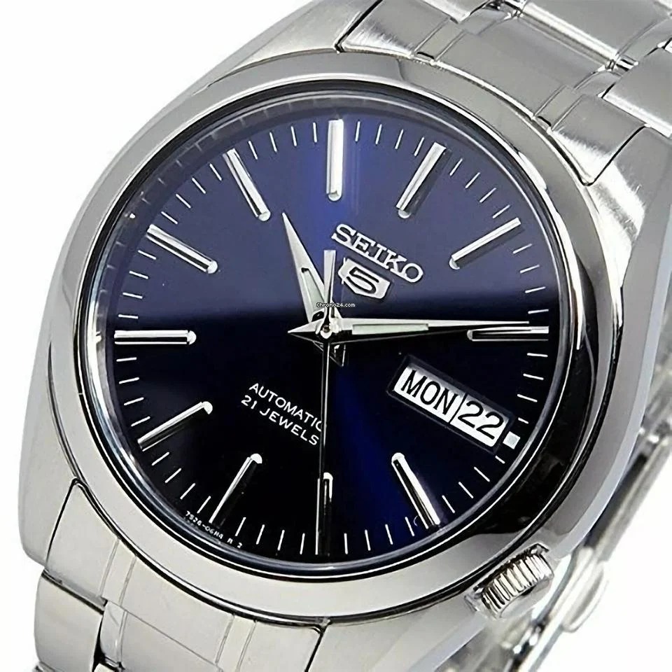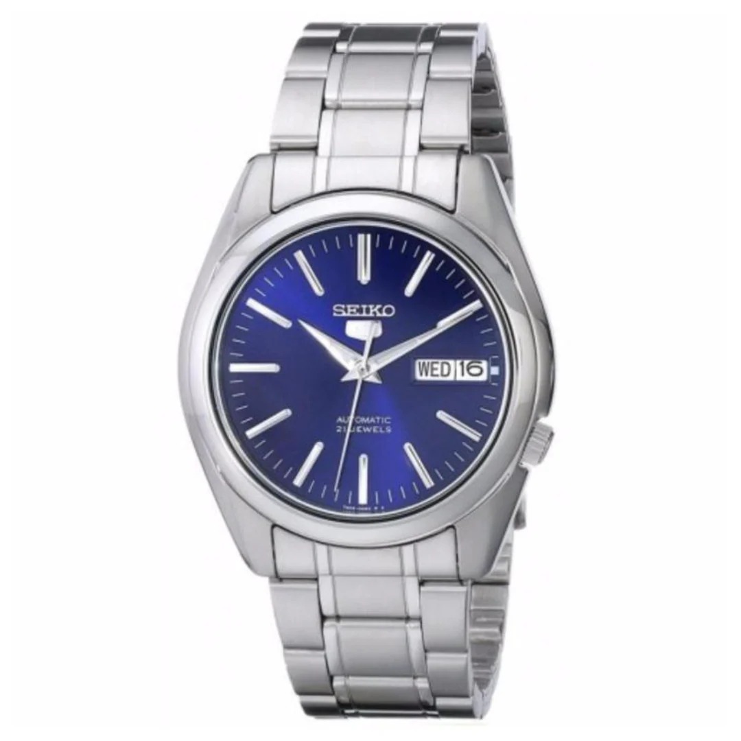 Reloj automático clásico para hombre Seiko SNKL43K1 de la icónica serie Seiko 5, diseño elegante con caja de acero inoxidable plateado, esfera negra con manecillas e índices luminosos, movimiento automático Seiko calibre 7S26 con 21 joyas que no requiere batería, función de día y fecha en la posición de las 3 h, cristal Hardlex resistente a rayaduras, fondo de caja transparente que permite ver el mecanismo interno, brazalete de acero inoxidable con cierre desplegable seguro, resistente al agua hasta 30 m (3 ATM) para salpicaduras y lluvia ligera, estilo versátil ideal para uso diario casual y formal con fiabilidad japonesa. (seikowatches.com)