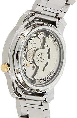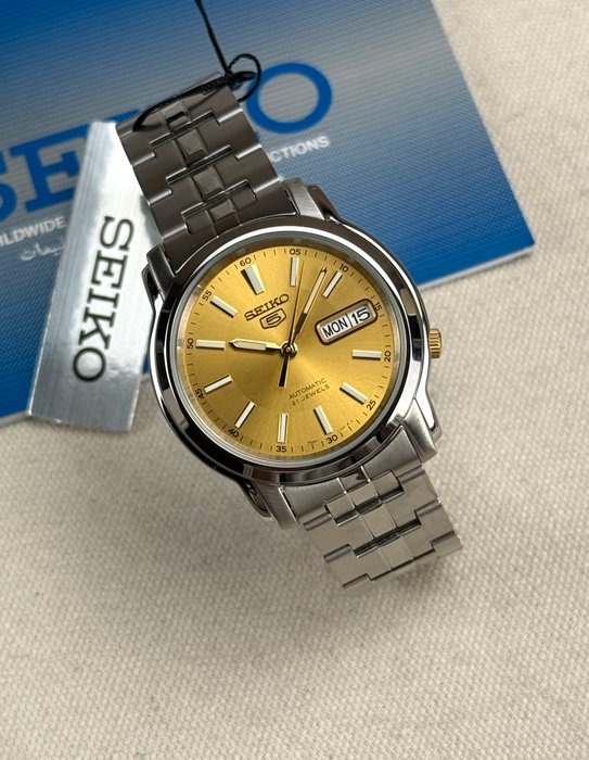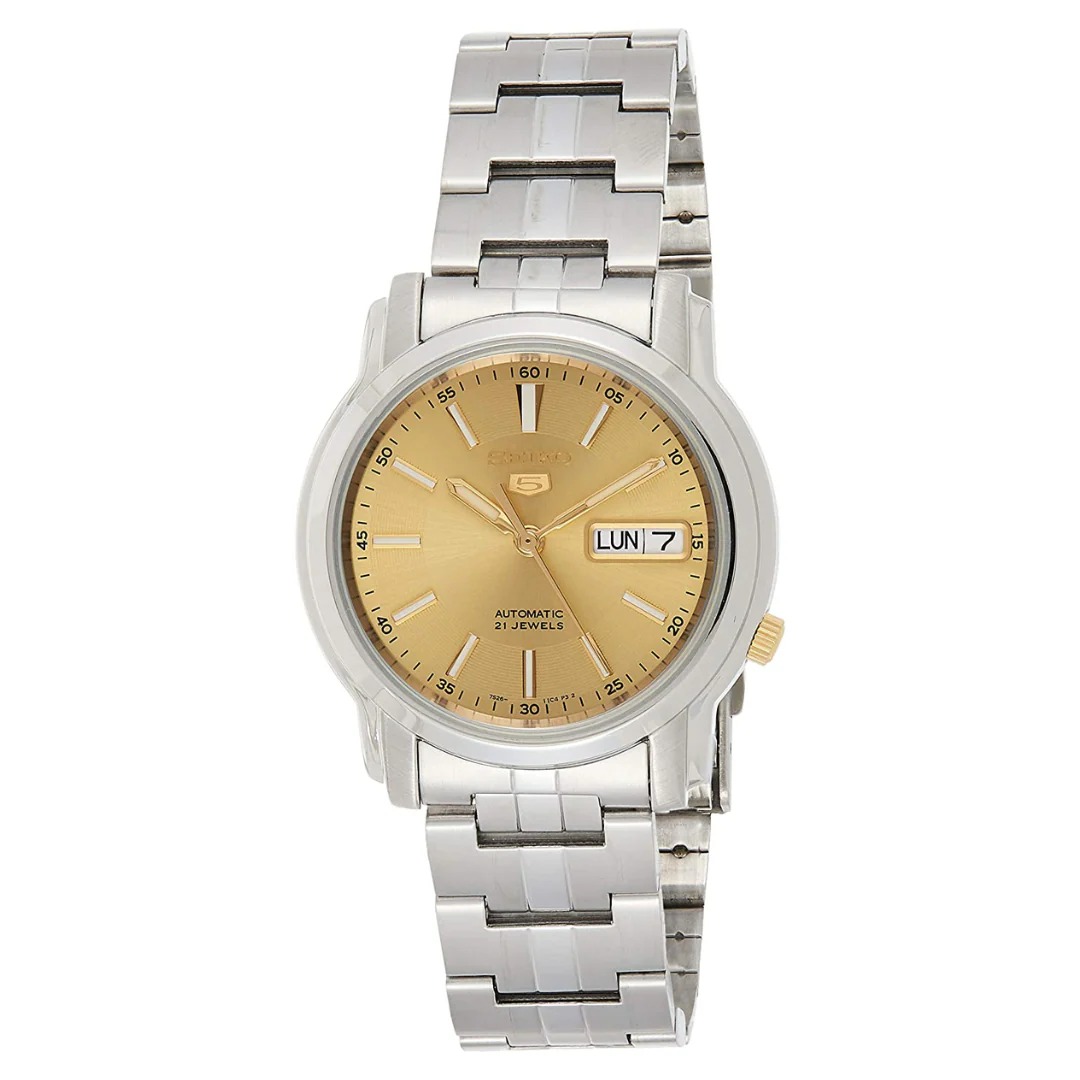 Reloj automático Seiko SNKL81K1 de la reconocida línea Seiko 5 con diseño clásico y elegante, caja y brazalete de acero inoxidable plateado, esfera dorada tipo champán con índices y manecillas luminosas para fácil lectura, movimiento automático Seiko calibre 7S26 de 21 joyas con reserva de marcha de aproximadamente 40 horas, cristal Hardlex resistente a impactos, ventana de día y fecha a las 3 h, fondo de caja transparente que permite ver el mecanismo interno, resistente al agua hasta 30 m, perfecto para uso diario casual o formal, combinación de estilo sofisticado y calidad tradicional japonesa.